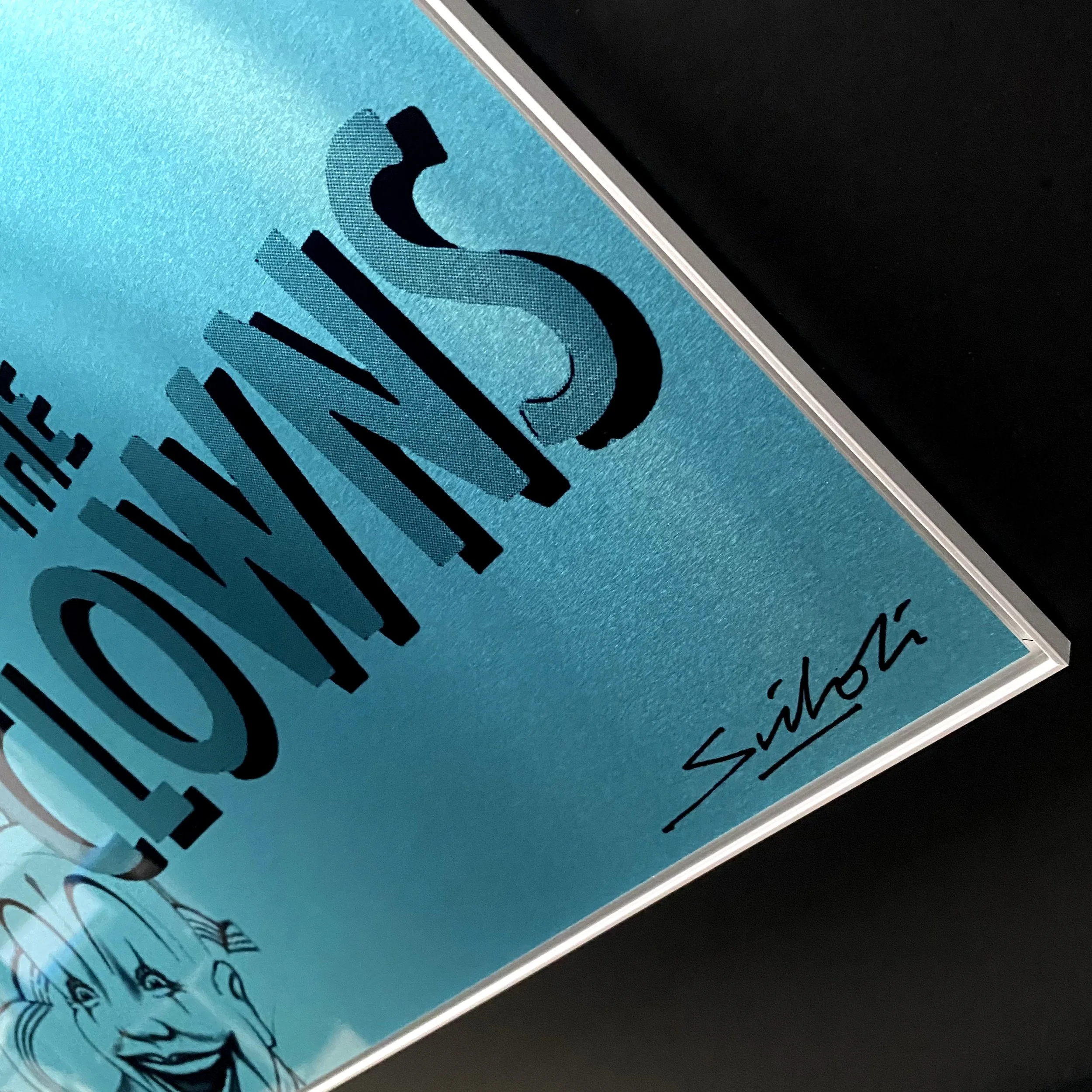 The artwork draws inspiration from the acclaimed 2019 Joker film starring Joaquin Phoenix and the Frank Sinatra song "Send In The Clowns," a notable feature of the movie. The film, set in 1981 and loosely based on DC Comics characters, chronicles the journey of Arthur Fleck, a failed clown and aspiring stand-up comic whose descent into mental illness and nihilism sparks a violent countercultural revolution against the wealthy in a decaying Gotham City. The artwork itself presents a "light" versus "dark" split screen scenario, juxtaposing a vintage advertisement portraying carefree clowns fooling around with the caption "Send in the clowns" against a much darker alternative depiction of the Joker “sending in the clowns” to incite the angry crowds to "kill The Rich." This compelling scene is framed by a detailed map of Gotham City, showcasing landmarks such as the Arkham Asylum and Wayne Manor.
