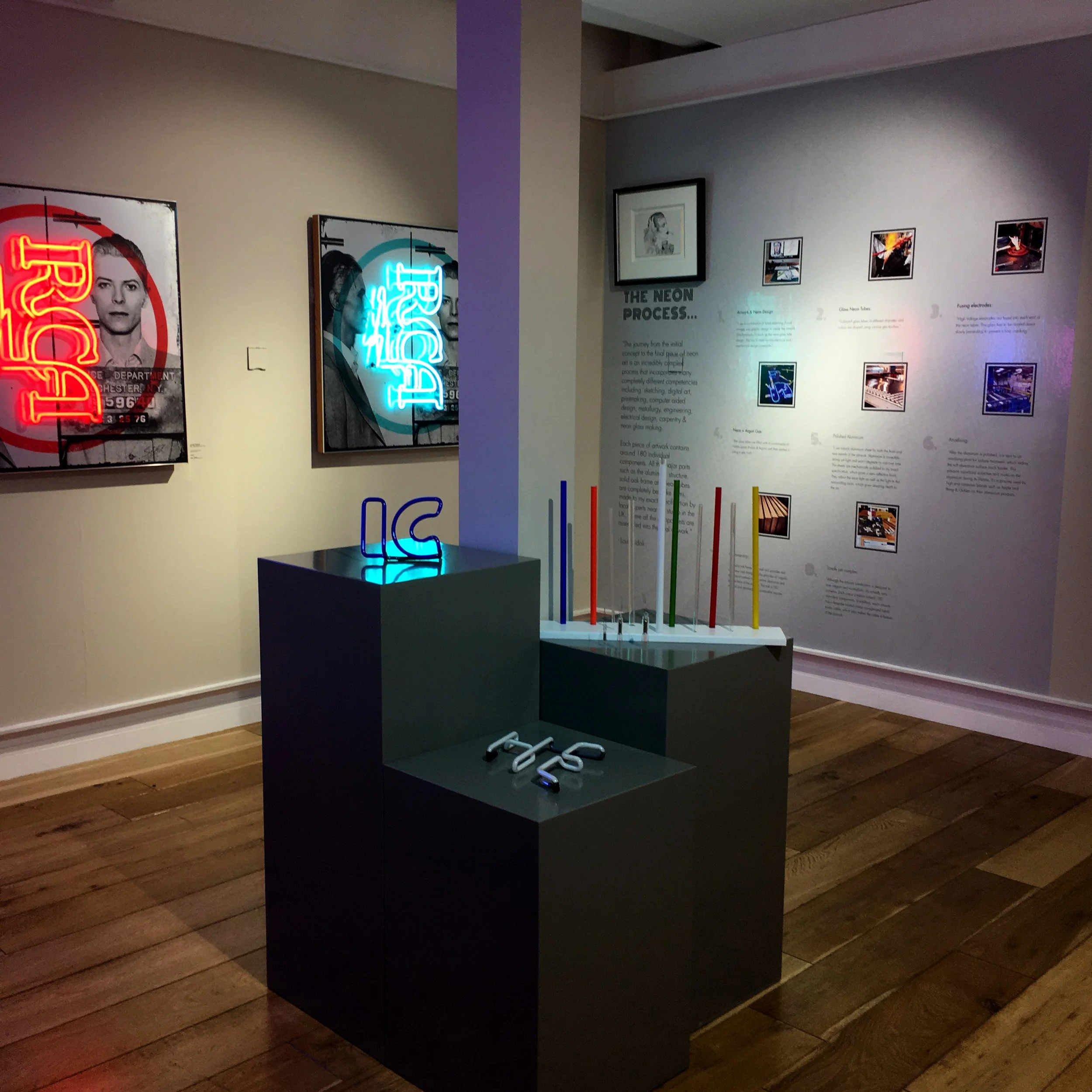 This solo exhibition of neon art was a tribute to the music legends "Golden Years" from 1970-1980, portraying him at the height of his artistic glory. The exhibitions featured 17 neon + aluminium artworks, bringing Bowie's iconic moments to life in a very unique way. A highlight of the exhibition was a collaboration with the Duffy Archive & The David Bowie Archive to re-imagine the “Aladdin Sane” image - one of the most famous images in pop culture history, taken by Brian Duffy in 1973.