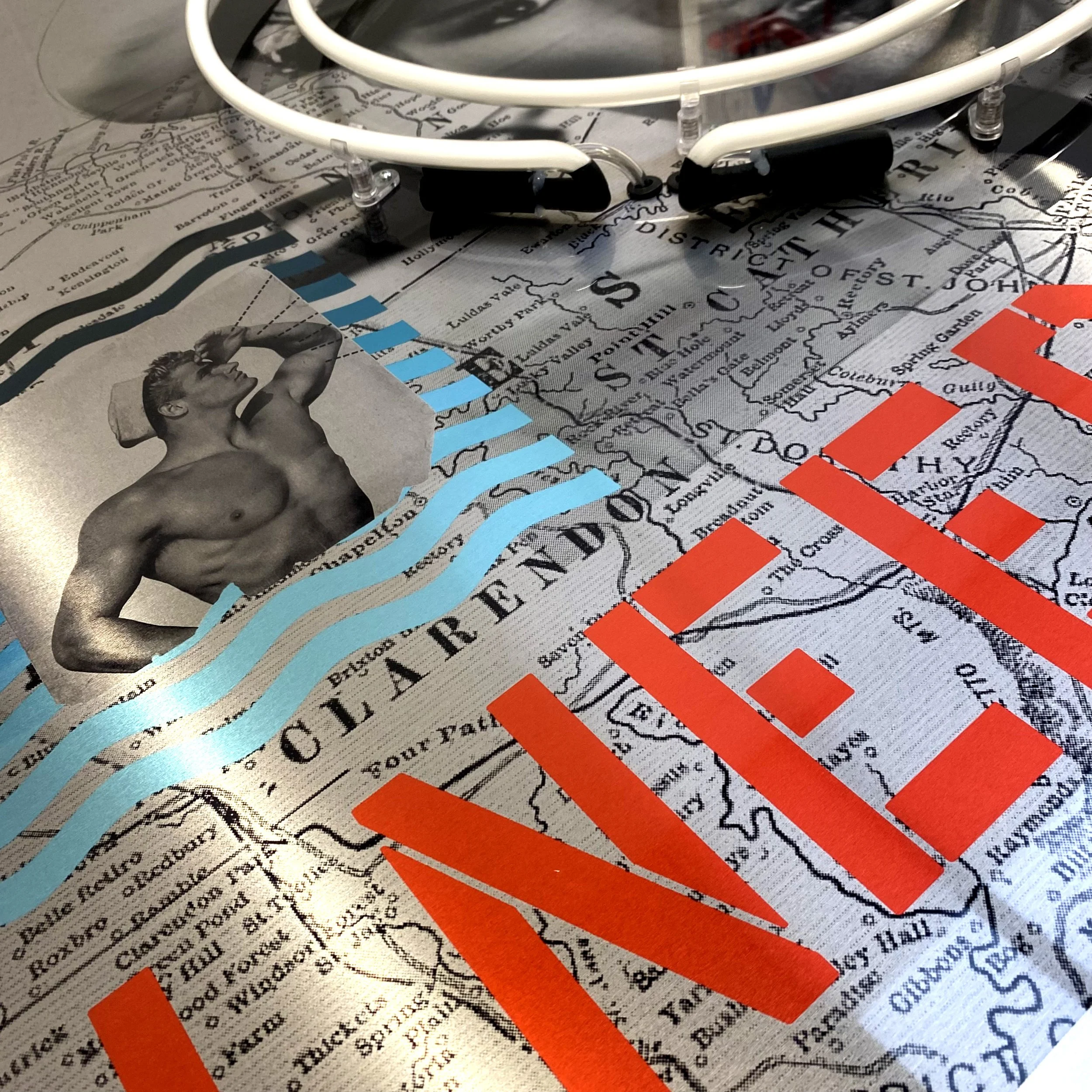The backdrop incorporates a print collage, carefully crafted from vintage materials. Delve into her roots with a map of Jamaica, the birthplace that shaped her into the legendary performer we know today. Adding a touch of unexpected is a torn image from a 1950's gay porn magazine featuring a sailor, referencing her status as a gay icon and enhancing the artwork's playful intrigue. Stealing the spotlight at the foot of the portrait is the title of her debut disco track "I Need A Man," stenciled with engineering precision.
